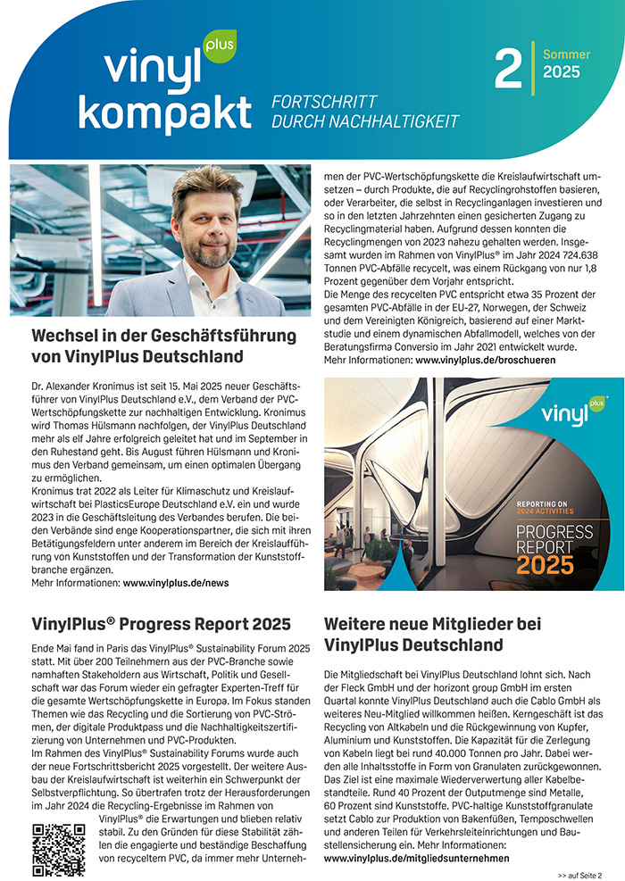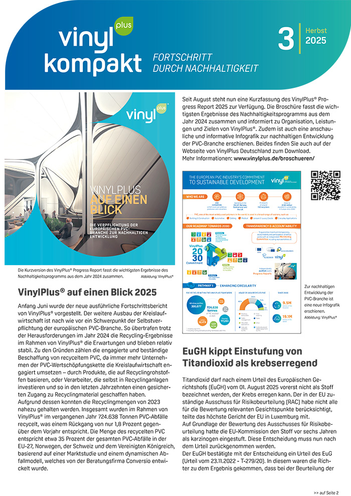 Der Newsletter VinylPlus kompakt (vormals BLITZ INFO) fasst aktuelle Informationen über die nachhaltige Entwicklung von PVC zusammen. Er wird dreimal im Jahr an rund 7.800 Umweltentscheider aus Politik, Verwaltung, Industrie und Handel sowie Architekten und Planer versandt und liegt dem Magazin STARKE SEITEN bei.